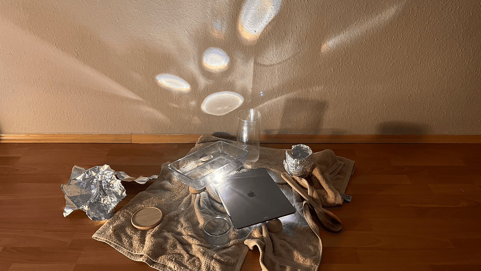 Creating convincing caustics required physical experimentation. Different vessels, water levels and distances between light source and surface were tested until the projection reached the right balance of movement, clarity and calm.