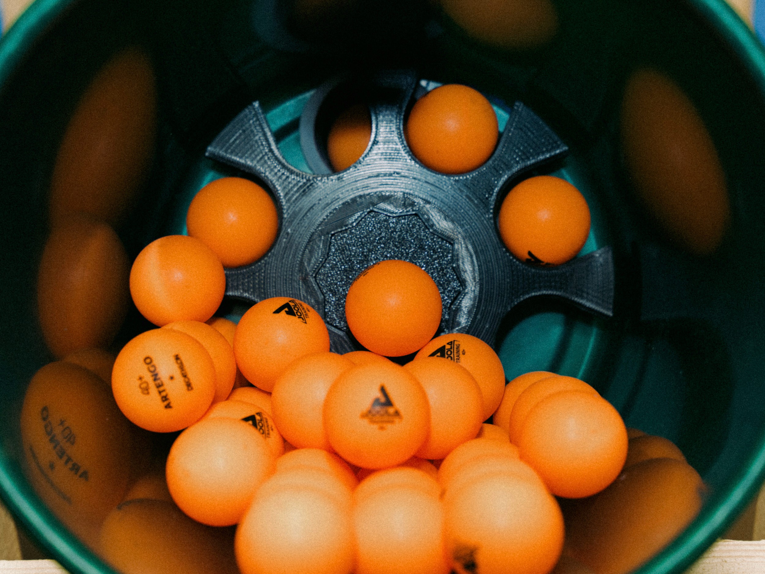 The central launch system of the machine was called Trinity. Three motors with rubber wheels generate different spin variations to simulate realistic table tennis shots. Additional servo motors adjust the direction of the ball. A key innovation is the ball handling system which allows the machine to use every ball inside the container, even the final one.